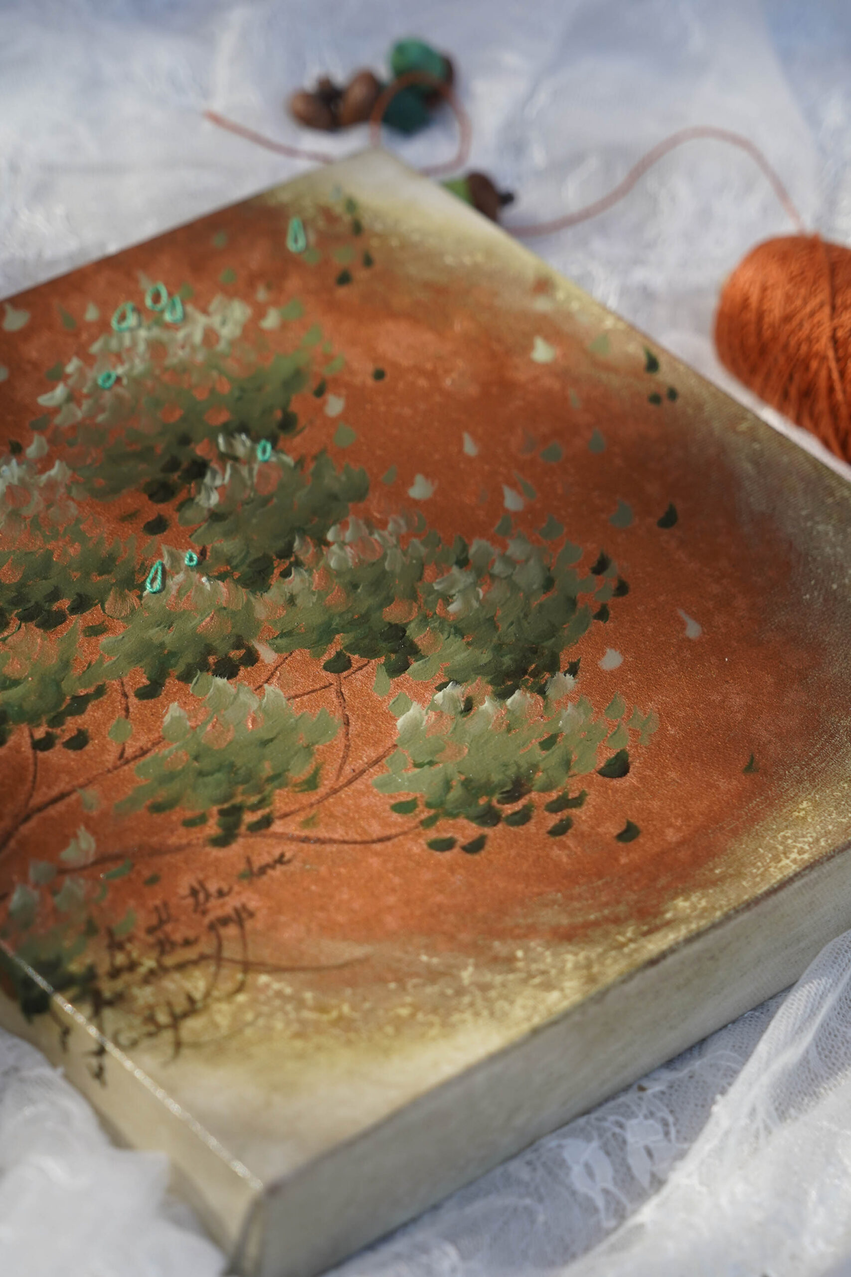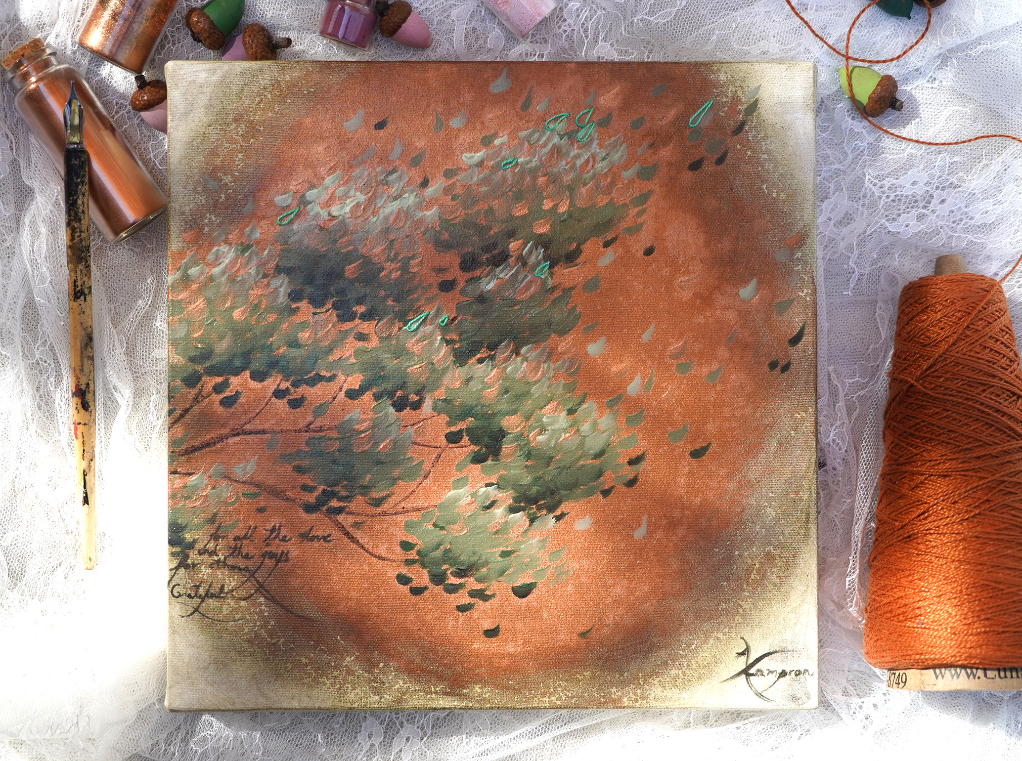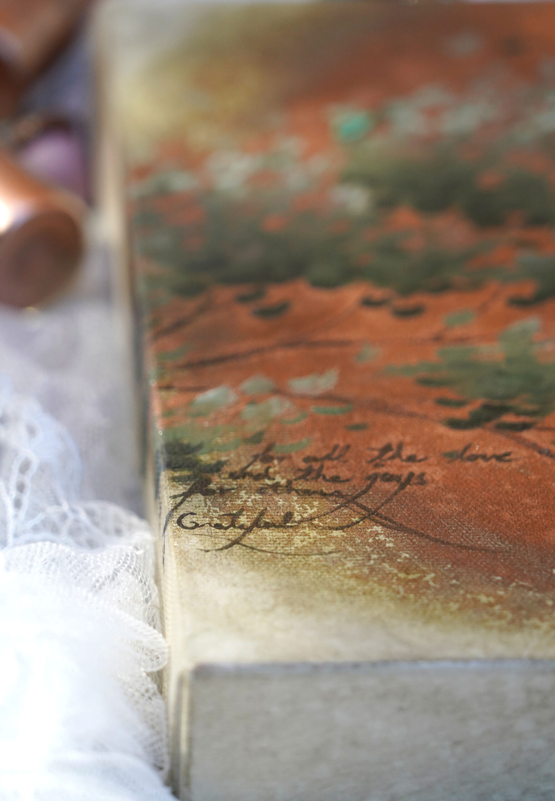On peut y découvrir un extrait de poésie et une touche de broderie sur le canevas de toile style Galerie